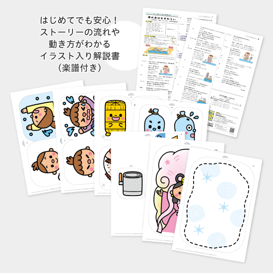絵カード・シナリオ・挿入歌の楽譜・演じ方解説書つきで、保育の現場ですぐに使える、便利なキットです。